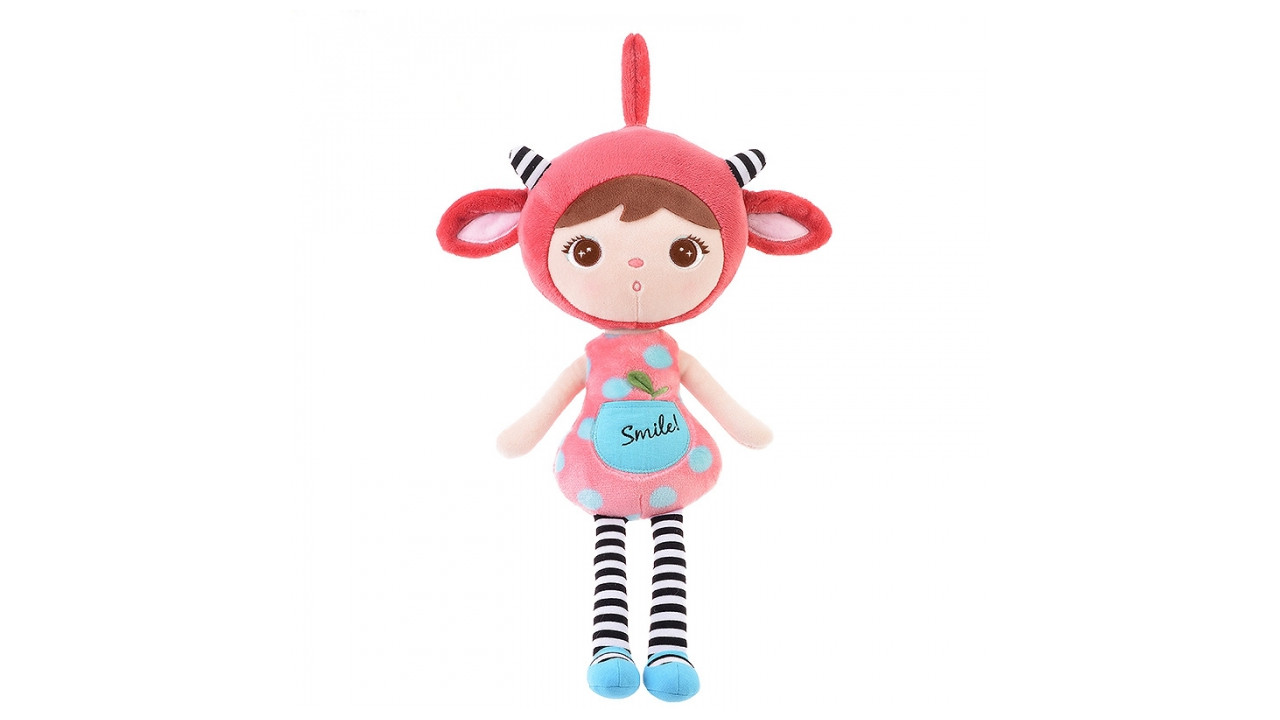 Handrová bábika Metoo Smile s ružovú čiapočkou a ružovými topánočkami.
