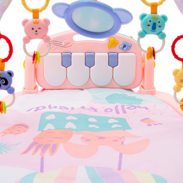 Krásna vzdelávacia hracia deka a s hracím piánkom rozvíja detskú predstavivosť vďaka spoznávaní farieb a tvarov. Mäkká polstrovaná deka so sviežim dizajnom je ľahká a ľahko prenosná. Súčasťou deky je aj malý vankúšik. Pripojené piánko funguje v troch režimoch: prehráva hudbu alebo funguje ako klavír. Zavesené hračky: hrkajúce zvieratká a zrkadlo.