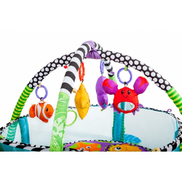 Hracia deka s postrannou sieťou je vyrobená z príjemnej ľahkej a mäkkej tkaniny. Na deku sa dajú upevniť dve hrazdičky na ktoré sa zavesia hrkálky a šuštiaca textilná knižka, ktoré podporujú rozvoj zmyslov hmat, sluch a motoriku dieťaťa. Ďalej obsahuje farebné pastové loptičky. Vyrobené s dôrazom na každý detail a na potreby malých detí, ktoré poznajú svet. Deka sa dá použiť aj. bez tyčí - po ich zložení spadne aj sieťka tvoriaca ohrádku. Samotná deka potom skvele izoluje proti chladnej zemi, vymedzí hraciu zónu a úspešne nahradí koberec v detskej izbe.