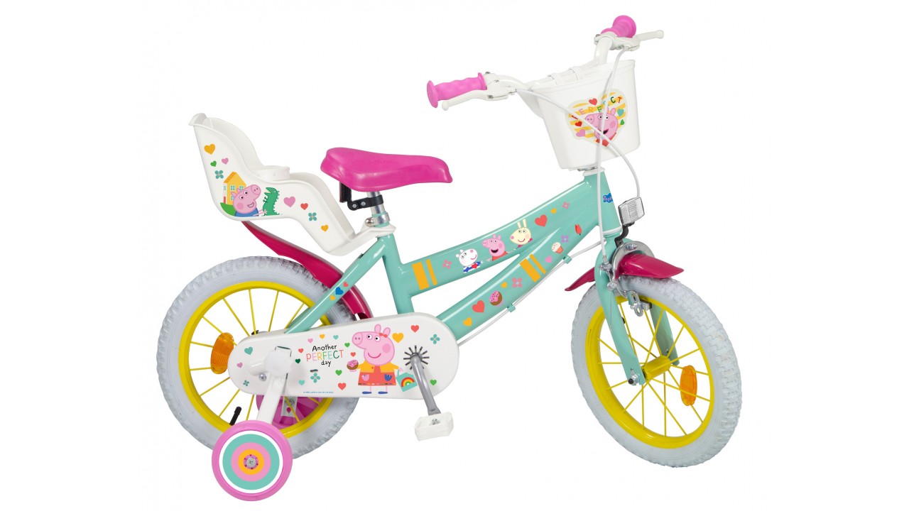 Detský bicykel Toimsa s nafukovacími kolesami aj s pomocnými kolieskami. S obľúbeným motívom Peppa Pig. Má bezpečnostné reflexné odrazky, nastaviteľná výška sedadla, nastaviteľná výška riadidiel, pomocné stabilizačné kolieska, brzdový systém. Bicykel má dva typy bŕzd – „V“ ráfikové a zadne bubnové, plný kryt reťaze, plastový blatník.mi aj s pomocnými kolieskami. Prevedenie s obľúbeným motívom Ružové prasiatka Peppa Pig.