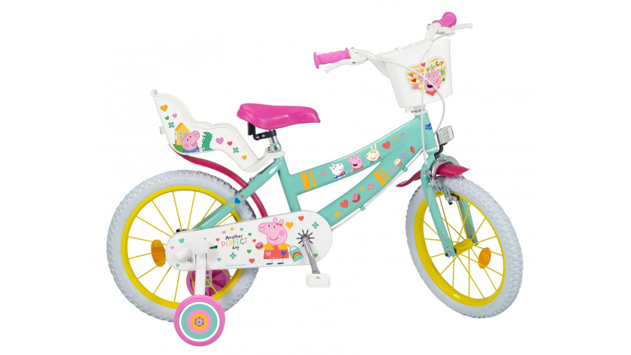 Detský bicykel Toimsa s nafukovacími kolesami aj s pomocnými kolieskami. S obľúbeným motívom Peppa Pig. Má bezpečnostné reflexné odrazky, nastaviteľná výška sedadla, nastaviteľná výška riadidiel, pomocné stabilizačné kolieska, brzdový systém. Bicykel má dva typy bŕzd – „V“ ráfikové a zadne bubnové, plný kryt reťaze, plastový blatník.mi aj s pomocnými kolieskami. Prevedenie s obľúbeným motívom Ružové prasiatka Peppa Pig.