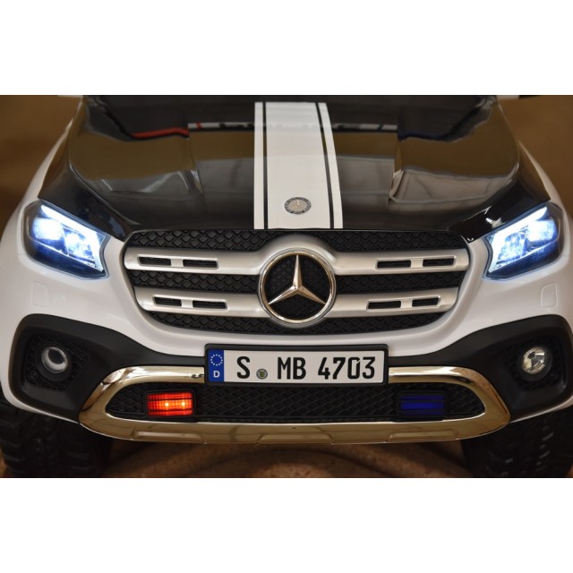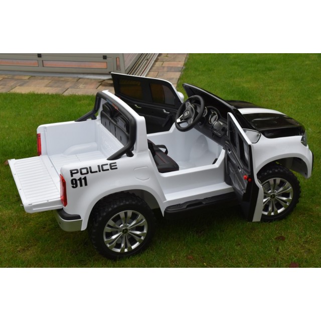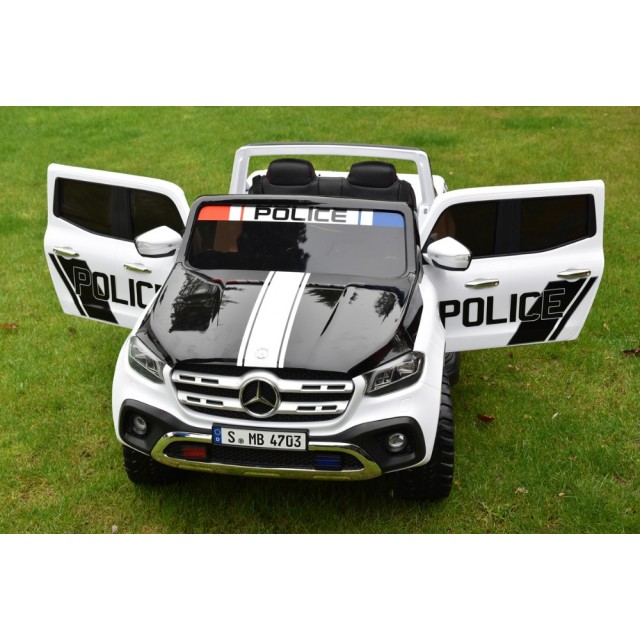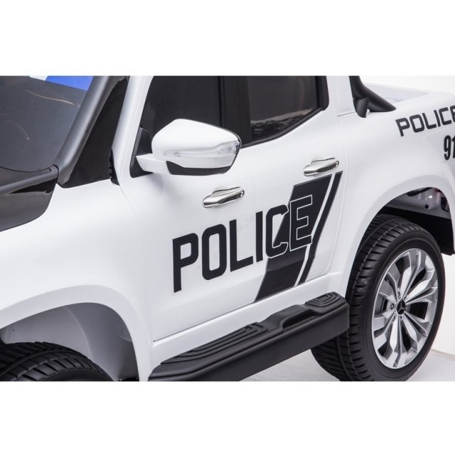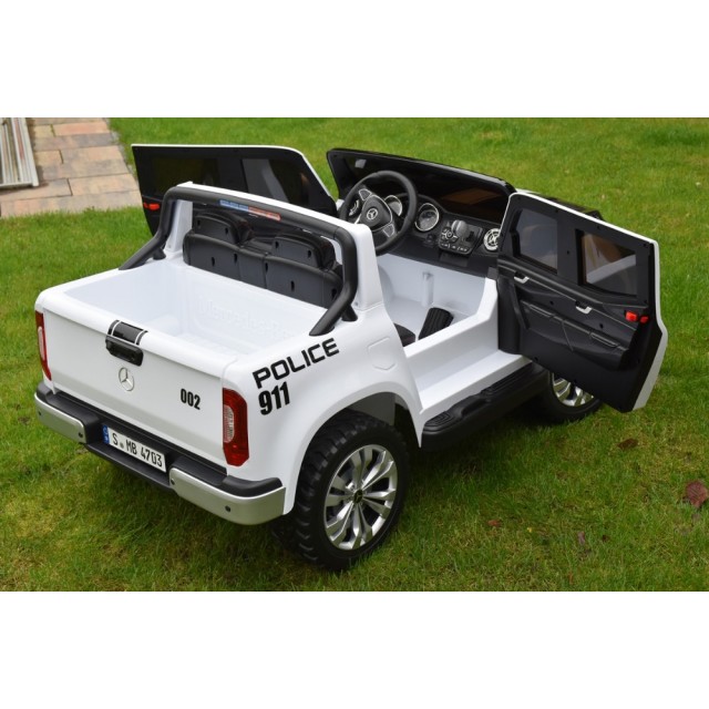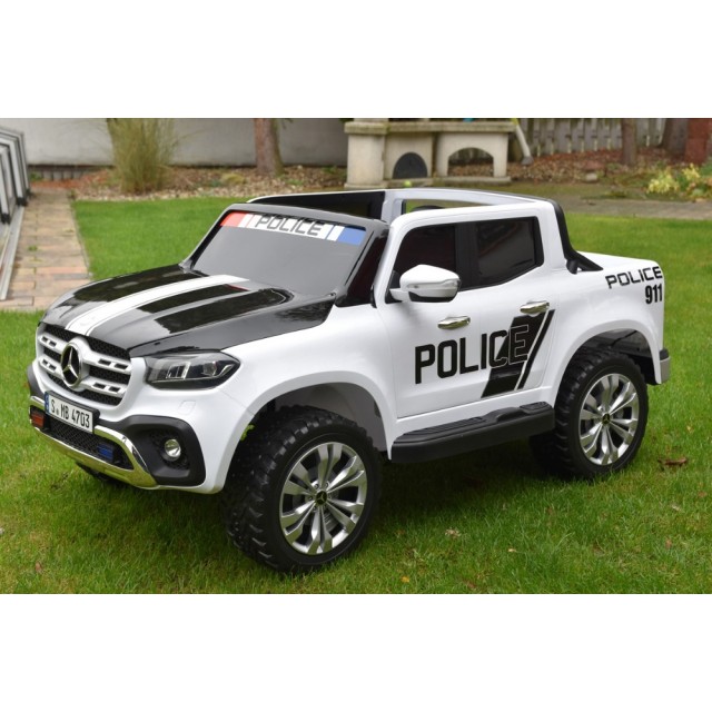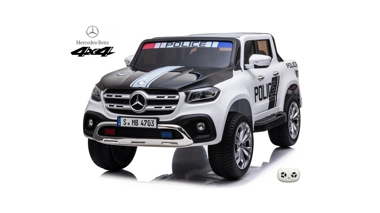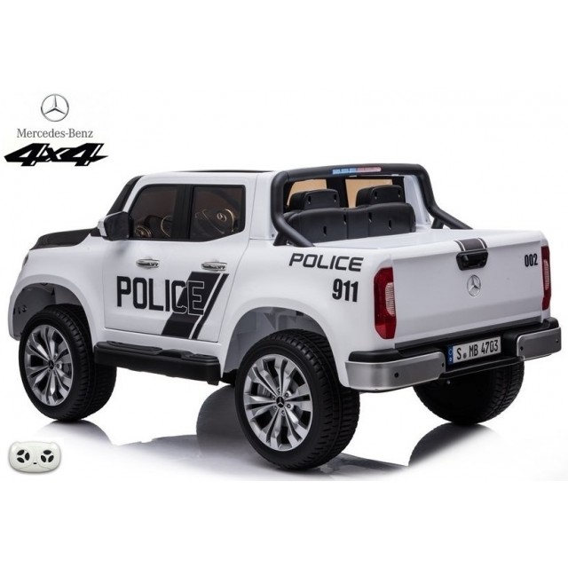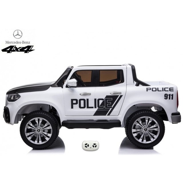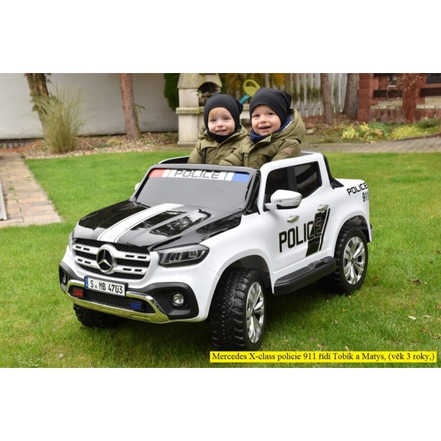 Elektrický pickup Mercedes X-Class 4x4 POLICIE 911 s 2,4G bluetooth dálkovým ovládáním, náhon všech EVA kol 4x4, efekty policie USA světelné LED a houkačka se sirénou, FM rádio, Bluetooth, USB, SD, voltmetr, LED osvětlení, zábavná funkce rocking horse, otvírací dveře a zadní čelo, madlo pro tažení, čalouněná dvousedačka s pásem, kvalitní materiály a zpracování, originální vzhled, lakovaná barva,
