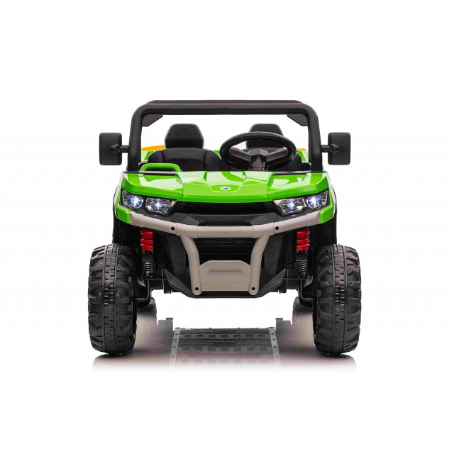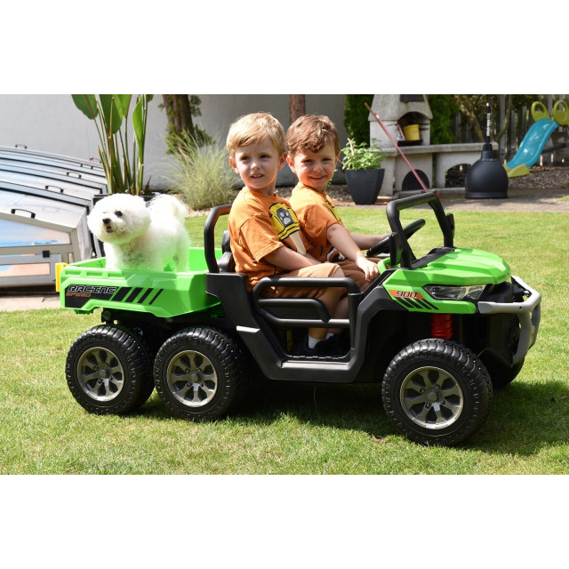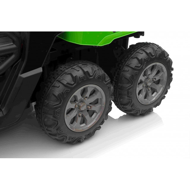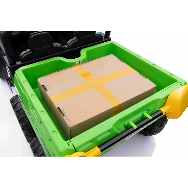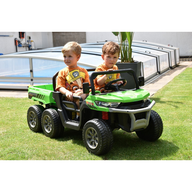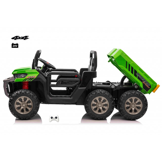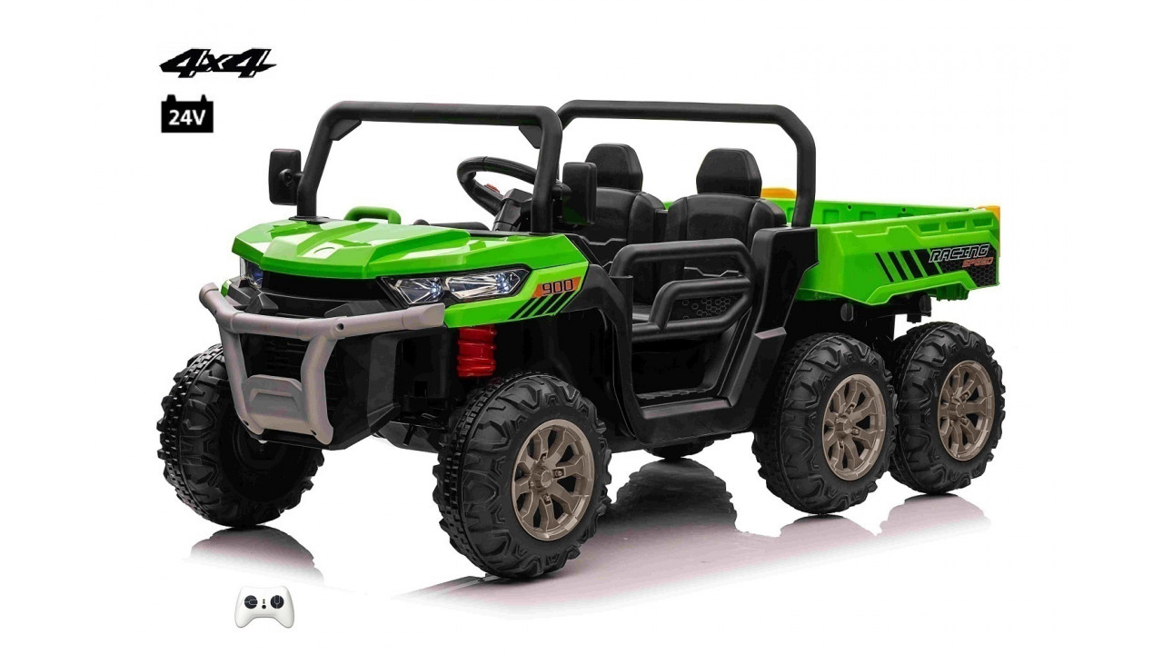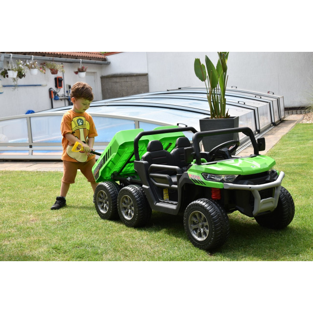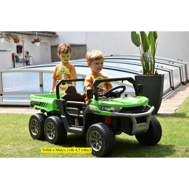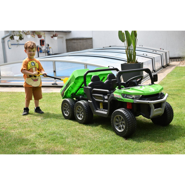 Elektrický 24V šestikolový Kipper farmer s 2.4G bluetooth dálkovým ovládáním, dvoumístný, 4 silné motory 24V/120W, baterie 24V/7Ah, Bluetooth, USB, LED osvětlení, voltmetr, odpružení, čalouněná sedačka s pásem, otevíratelné dveře, elektricky výklopná korba, kvalitní materiály a zpracování, originální vzhled,