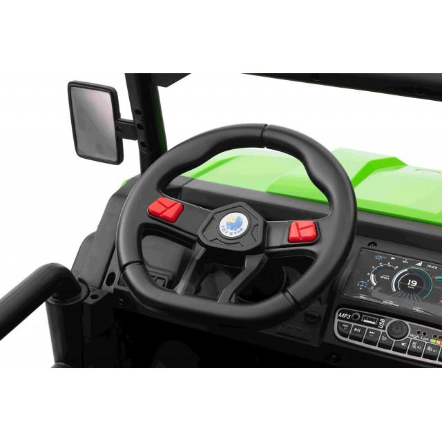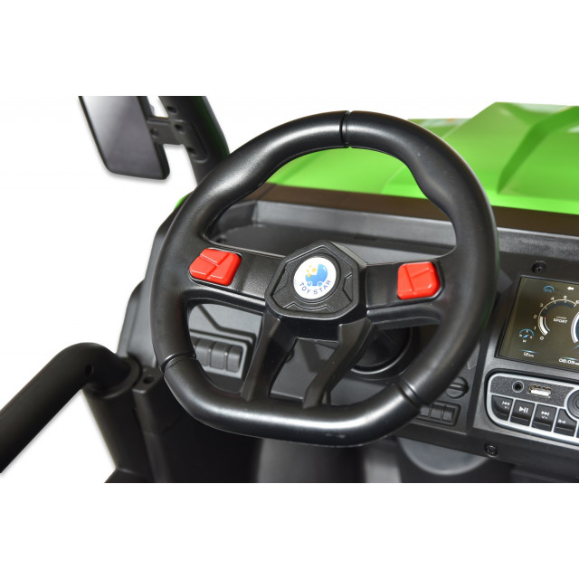 Detailní popis produktu audio player, USB, vstup Mp3, voltmetr nabití baterie, klakson, muzika, start a jízda motorů, přední LED světla, osvětlení...