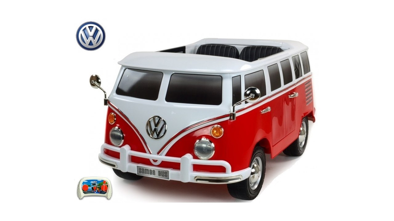 Licenční Volkswagen Transporter T1 Samba bus s 2,4G dálkovým ovládáním s přednostní jízdou a plynulým rozjezdem, 3 rychlosti vpřed/3vzad na DO, otvíracími dveřmi, Mp3, USB, TF, voltmetrem, světelnými LED efekty, originálním zvukem startování a jízdy, originální přístrojová deska, pérováním obou náprav, EVA koly, zadním otvíracím kufrem, výklopným madlem pro ruční odtažení, silnou baterií 12V/10Ah, 2 motory 45W / 12V, se 2 čalouněnými sedačkami 2x25cm s bezpečnostním pásem.