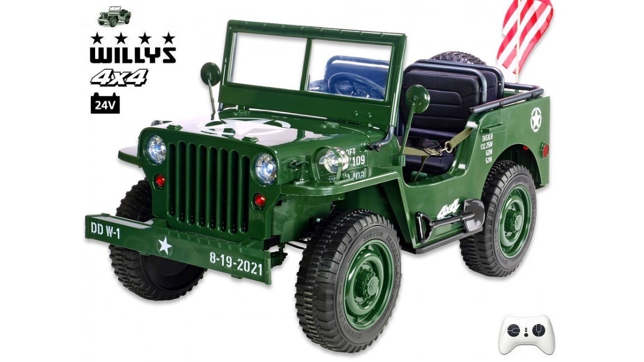 Elektrický Jeep Willys 24V, s 2.4G bluetooth diaľkovým ovládaním, 4x100W, náhon všetkých EVA kolies 4x4, odpruženie, USB, LED osvetlenie, otváracia kapota, úložné boxy, ťažné madlo, 3 čalunené sedačky s pásmi, 3 rýchlosti jazdy,vlajka USA, legenda 2 svetovej a Koreiskej vojny.