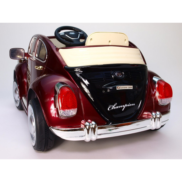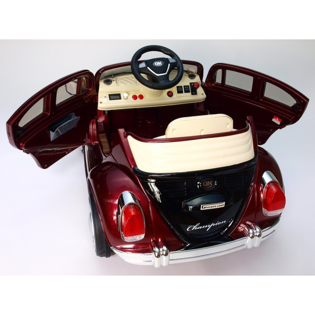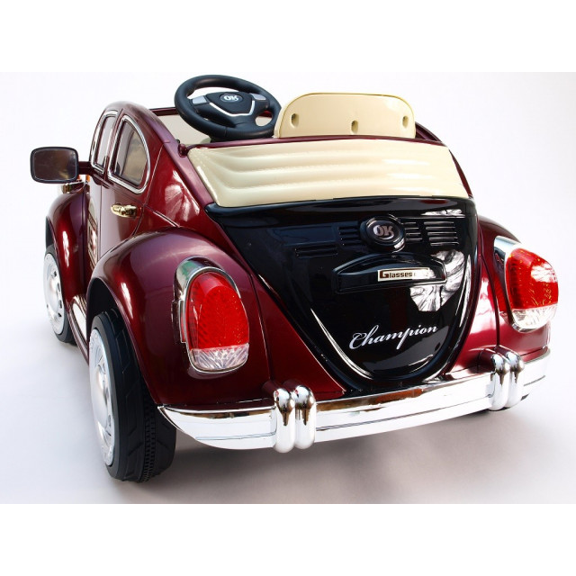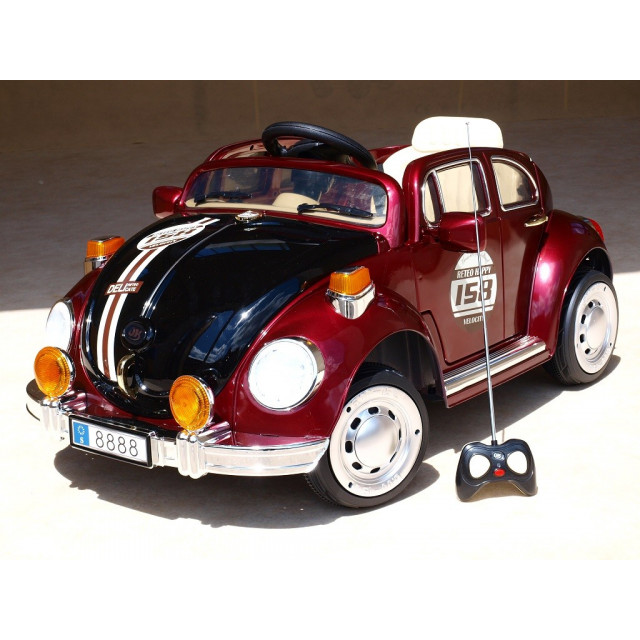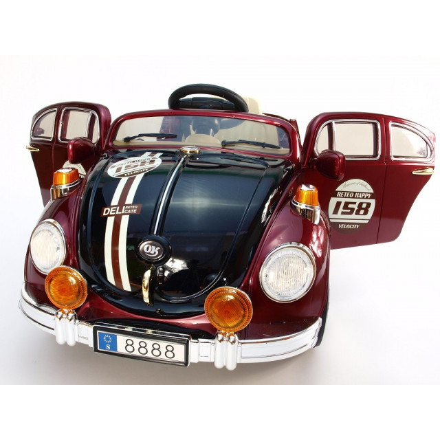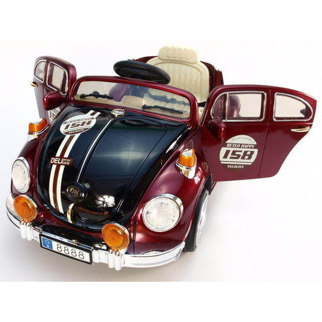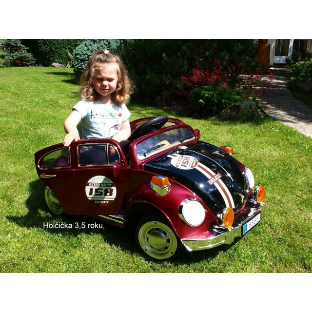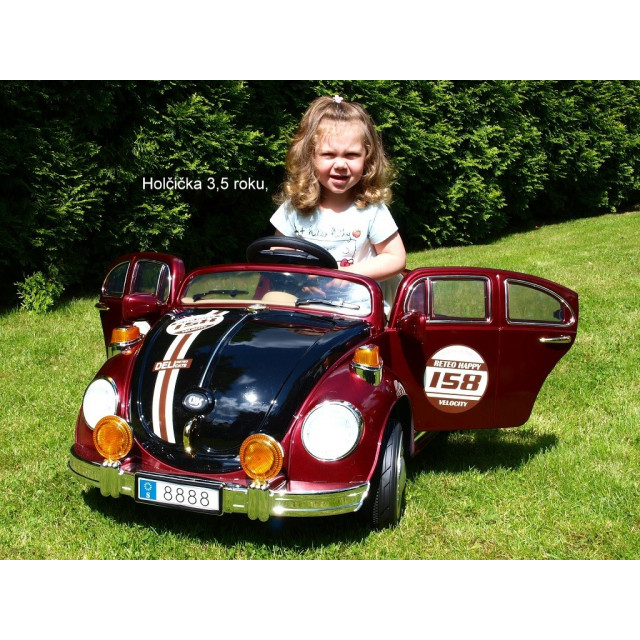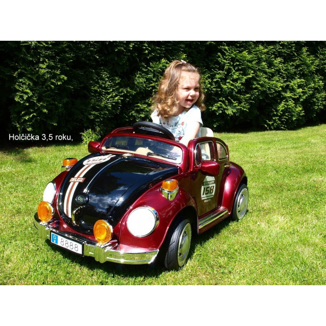Popis: auto má exkluzivní vzhled, kvalitní materiály a zpracování, 38cm širokou pohodlnou sedačku, Beetle jezdí vpřed a vzad, toto se ovládá řadící páčkou na přístrojové desce a nožním pedálem na podlaze, nebo se ovládá dálkovým ovladačem vpřed,vzad,pravá,levá, jízda na pedál nebo na dálkové ovládání a přepínání rychlosti se volí přepínačem, kola mají gumový pruh – tento zajišťuje tichou jízdu, při nesešlápnutém pedálu tah motoru nahrazuje brzdu, auto má náhon na obě zadní kola !! tím je vhodné i pro jízdu v terénu, při jízdě svítí budíky a blikají přední světla, 2 tlačítka ovládají efektní houkačku a melodie a mají otočné ovládání hlasitosti, přípojku na MP3, digitální voltmetr stavu nabití baterií, ve dveřích má schránku na drobnosti, pro větší bezpečnost dítěte je na sedačce stavitelný bezpečnostní pás, Beetle nevyžaduje mimo dobíjení a mytí jinou údržbu, jízdou v tomto fantastickém autě bude Vaše dítě všude středem pozornosti a zájmu okolí,