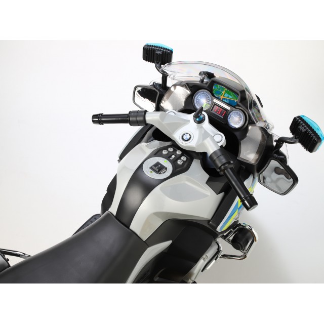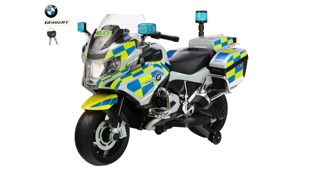 Elektrická motorka policie BMW R 1200RT, verze česká, anglická, švédská policie, stříbrná s modrožlutým olepením, start klíčem, voltmetr, LED osvětlení, blikající majáky, policejní zvuková siréna a houkačka, muzika, EVA kola, boční otvíratelné kufříky, veliký motor 12V/45W, baterie 12V/7Ah, kvalitní materiály a zpracování