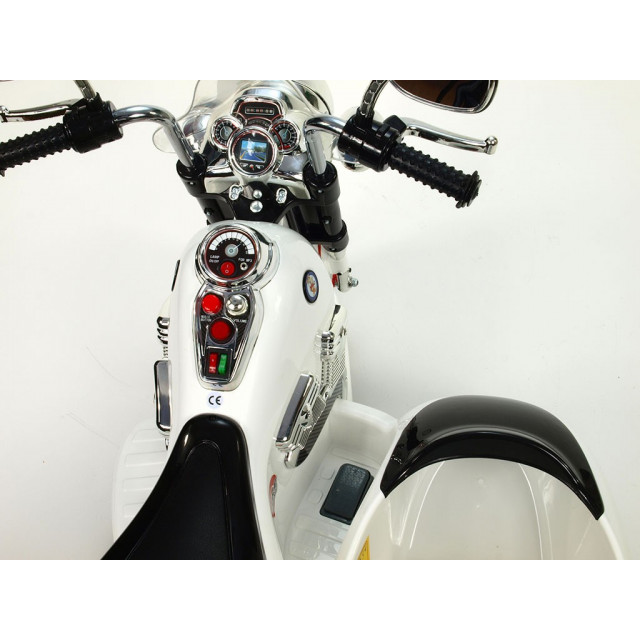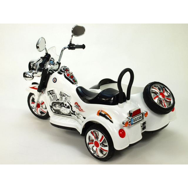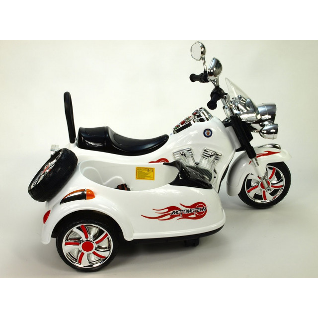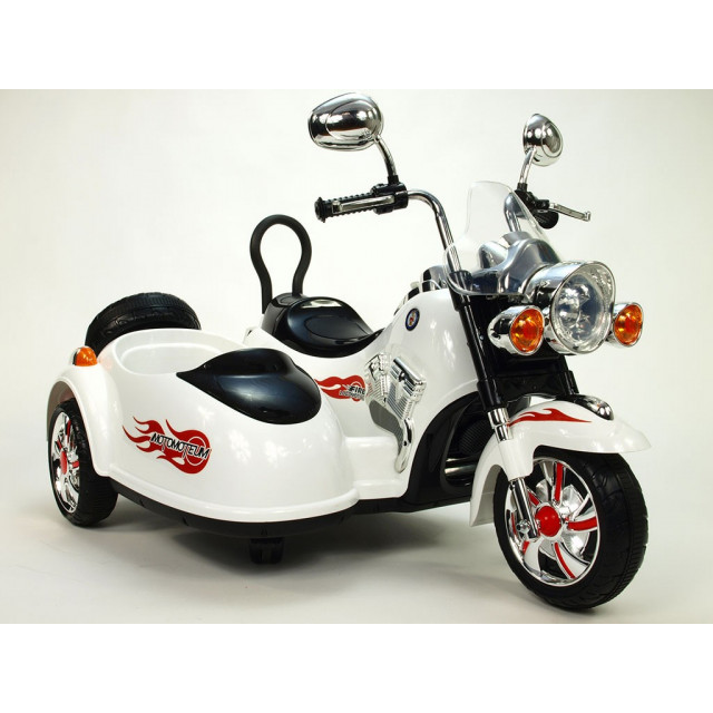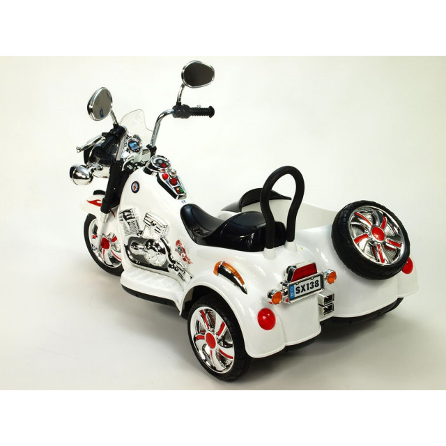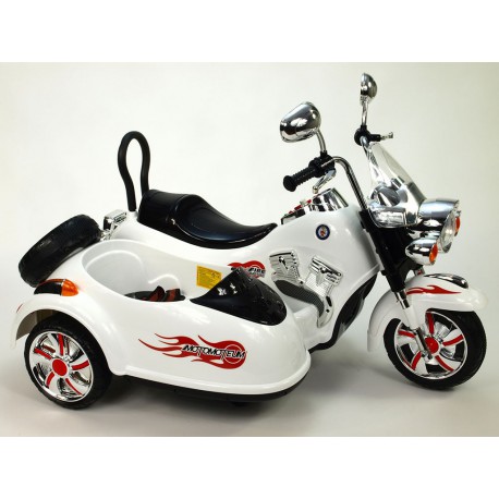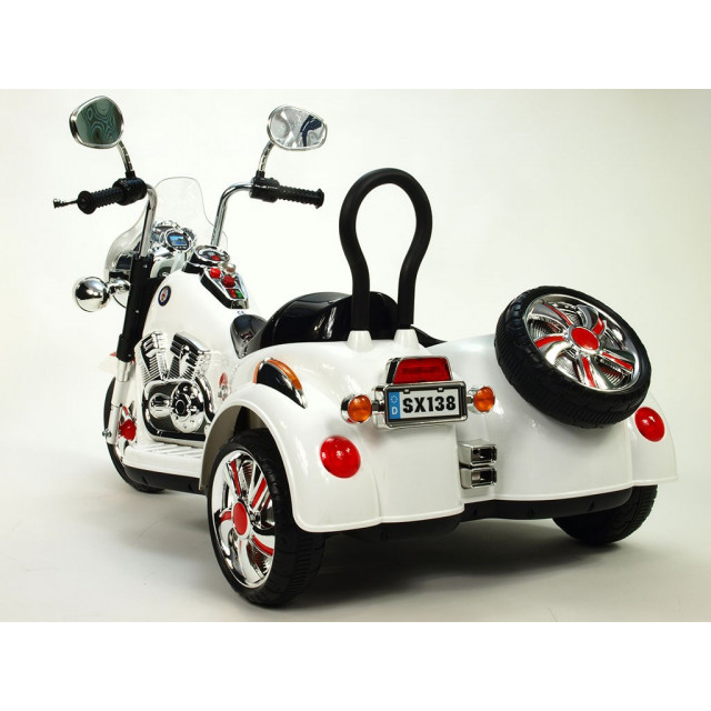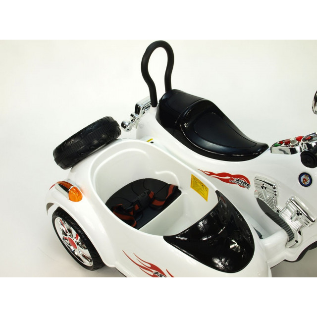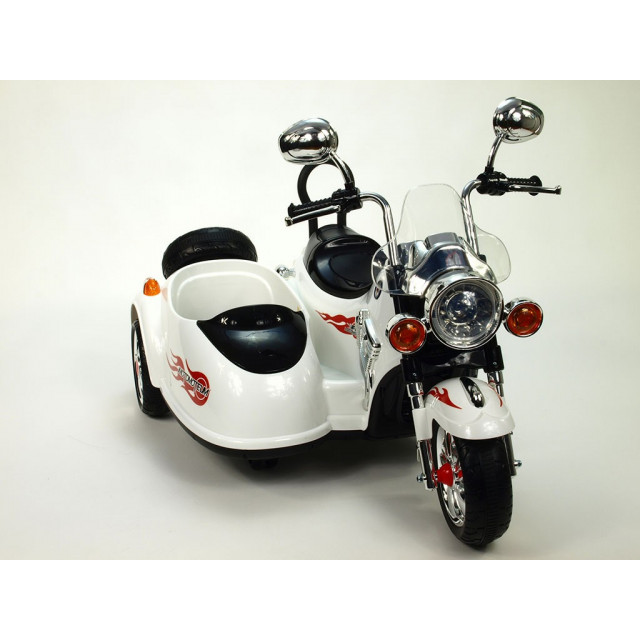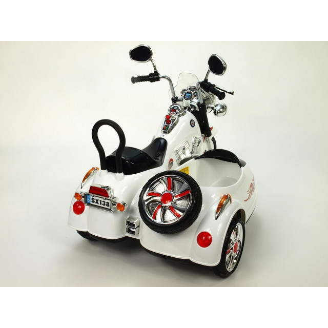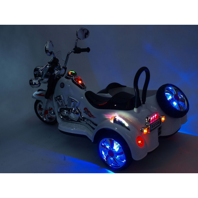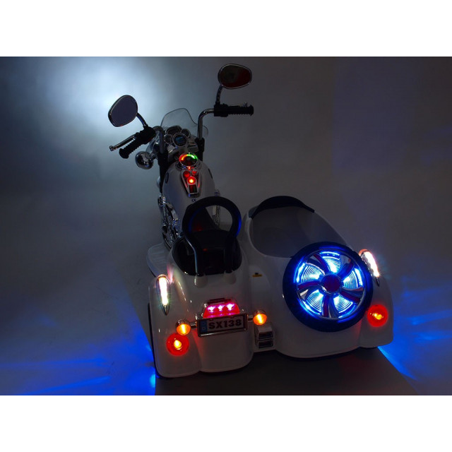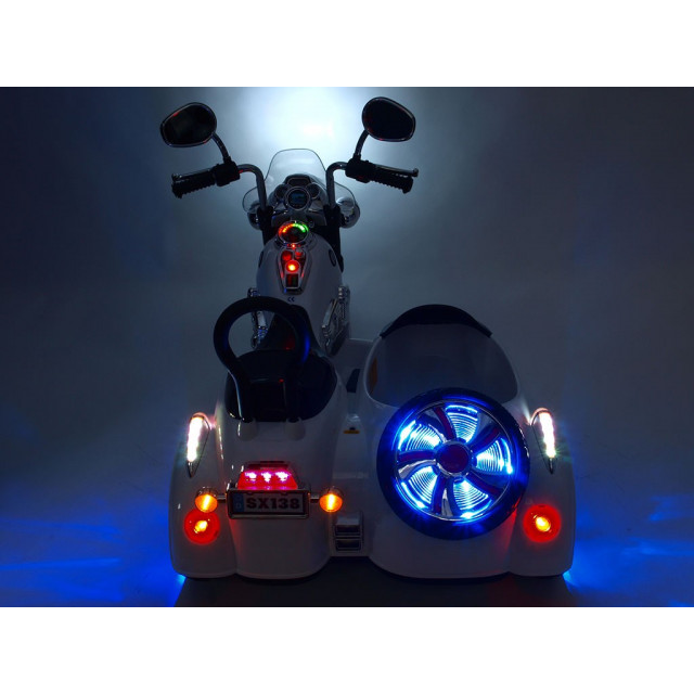 Elektrická 4 rychlostná motorka se sajdkárou, s masivní konstrukcí, neuvěřitelně efektním LED osvětlením – viz obrázky, zvukovými efekty, vstupem Mp3, náhonem obou zadních kol, 2 motory 45W / 12V, pérováním zadní nápravy,