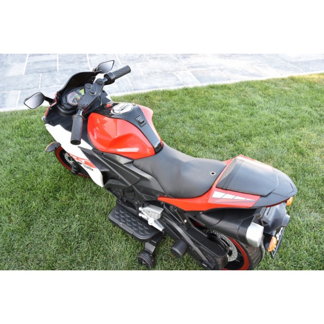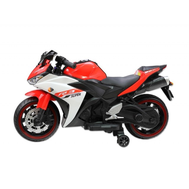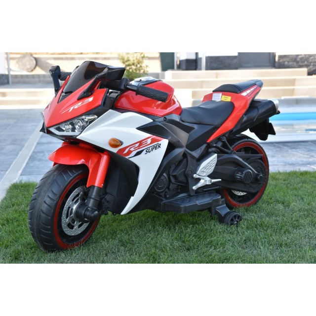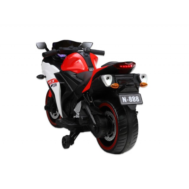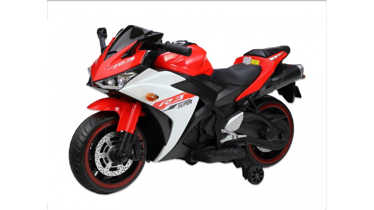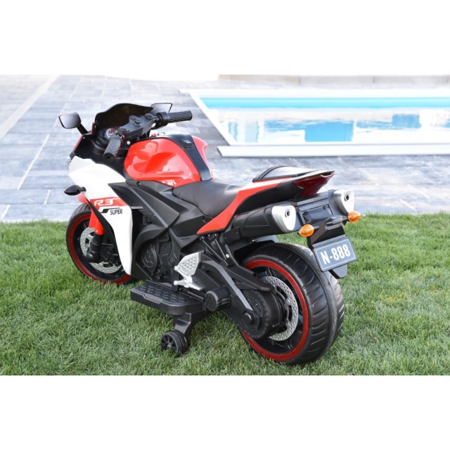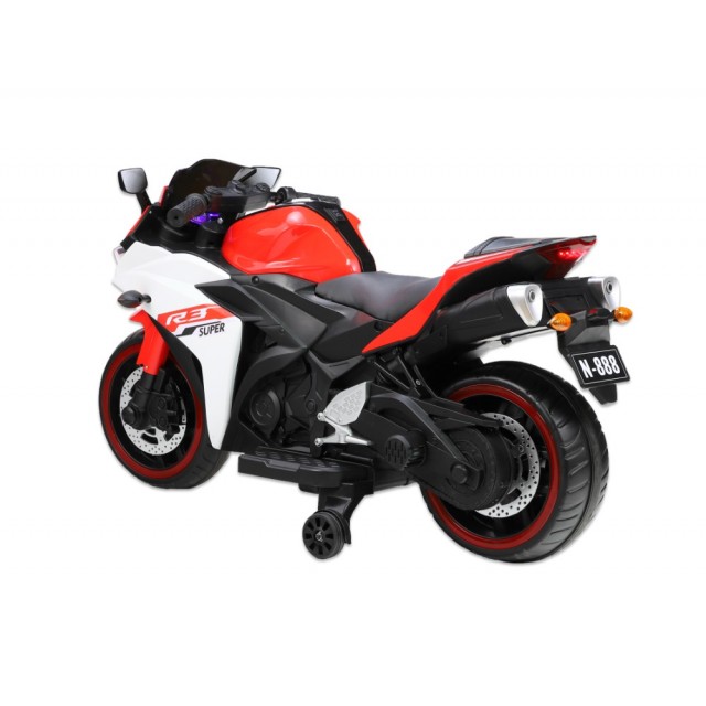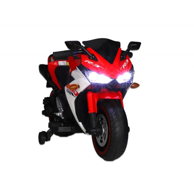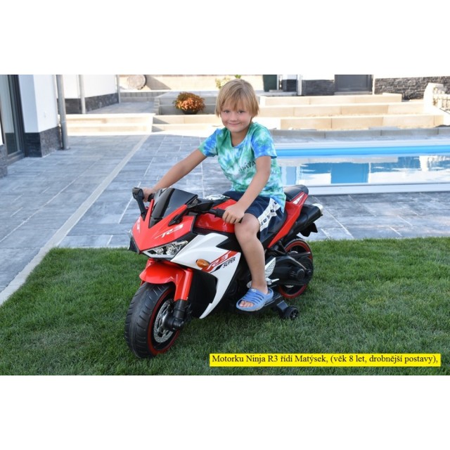 Elektrická cestná motorka Ninja R3, náhon na zadné koleso, motor 45W/12V, otočná plynová rukoväť na riadidlách, nožná brzda, USB, voltmeter, LED osvetlenie motorky a oboch kolies, čalunená sedačka, batérie 12V/7Ah, kolesá s gumovým pásom.