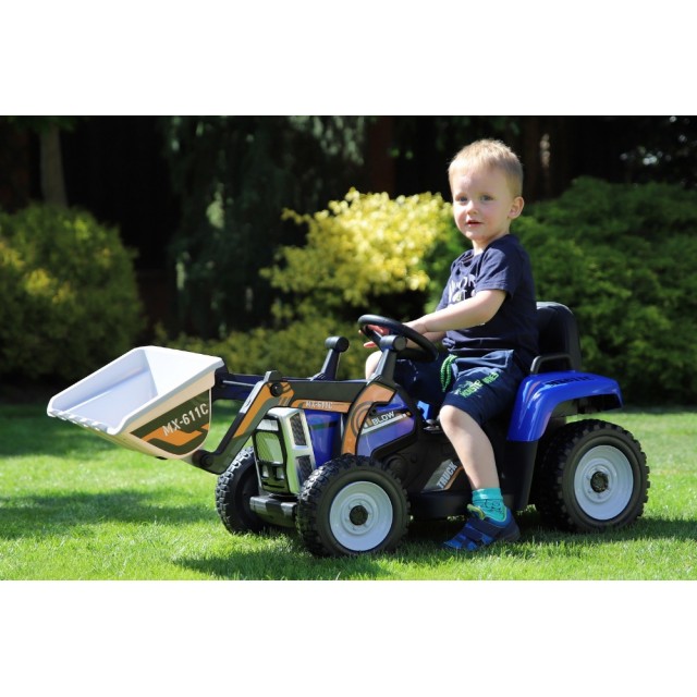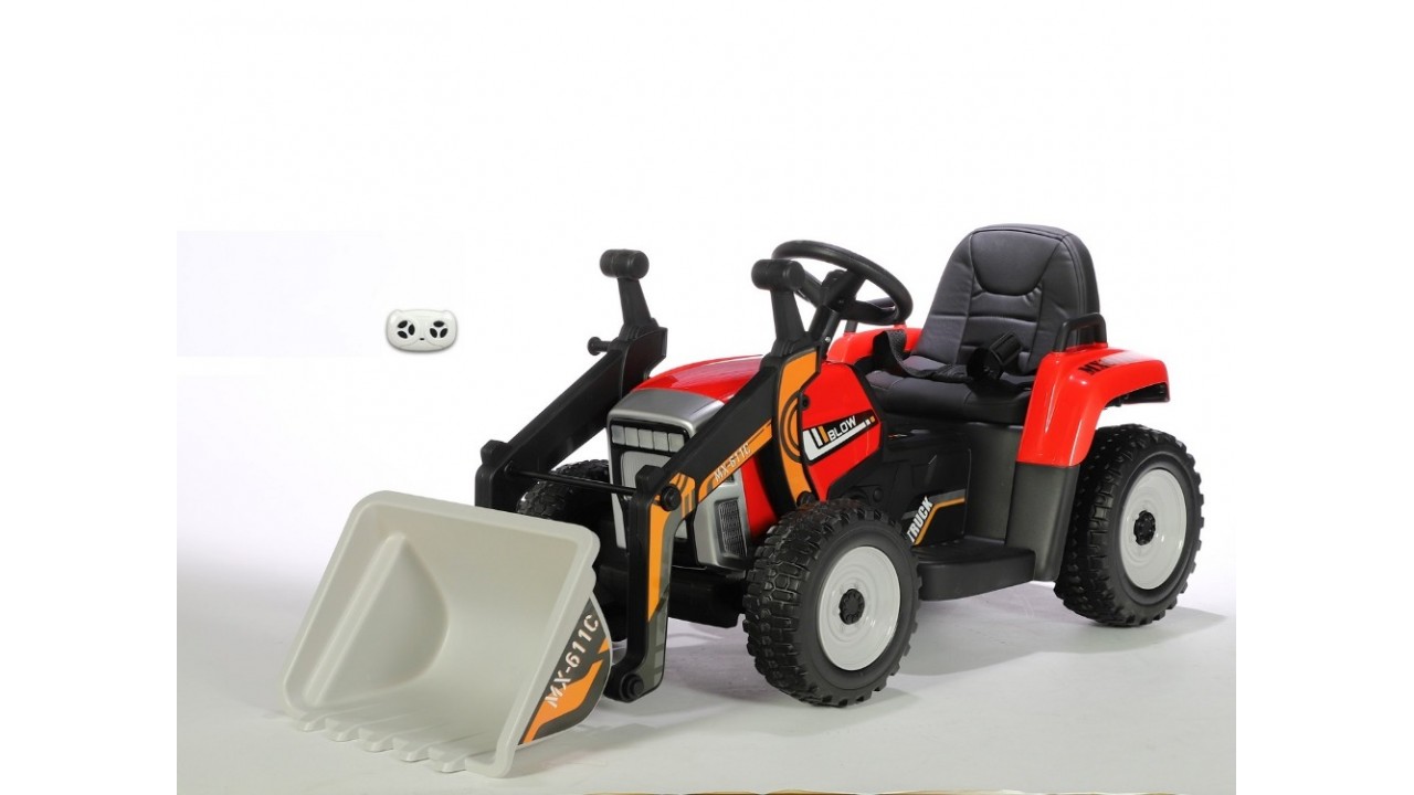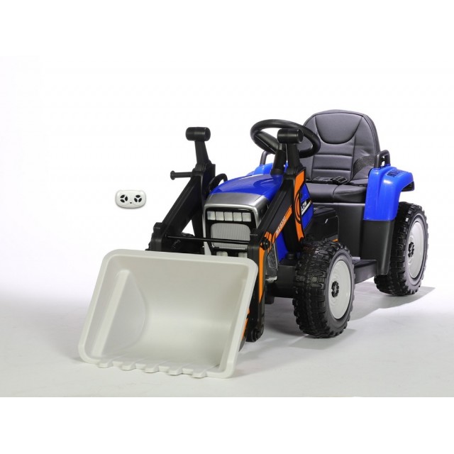 Elektrický traktor s funkčnou nakladacou lyžicou s 2.4G bluetooth ovládaním, funkčnou nakladacou lyžicou, Bluetooth pre prehrávanie hudby, USB, originálny zvuk štartu a jazdy motora, voltmeter, LED osvetlenie, čalunená sedačka, EVA kolesá, originálny vzhľad.