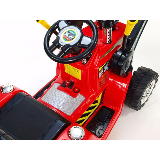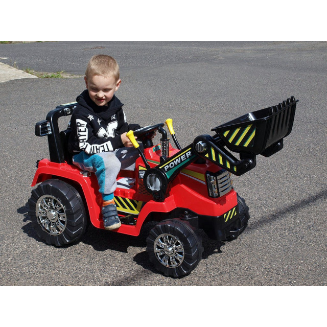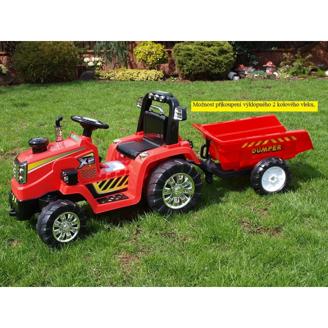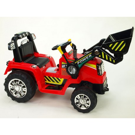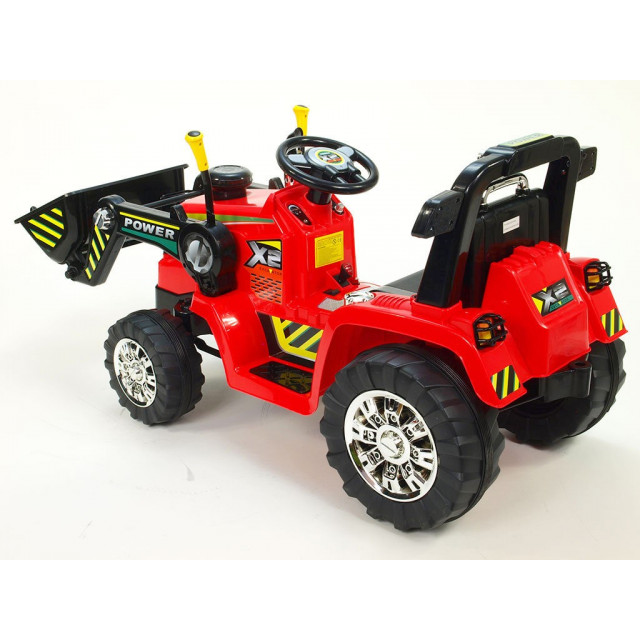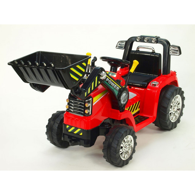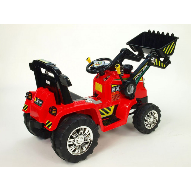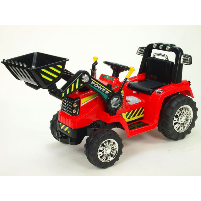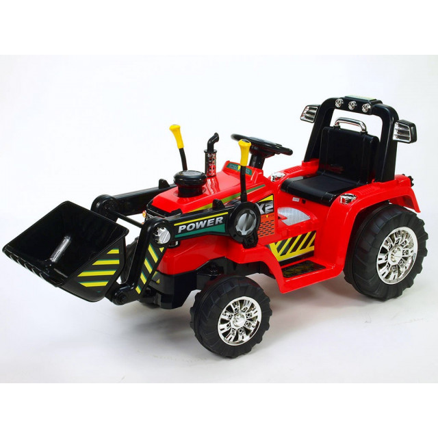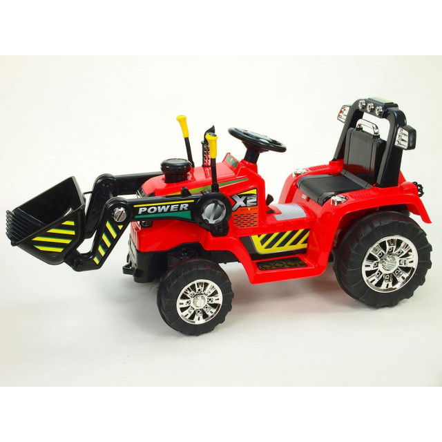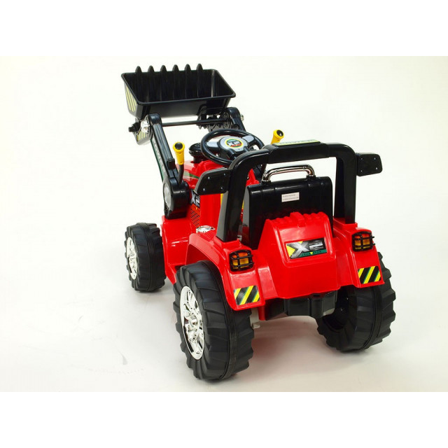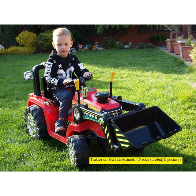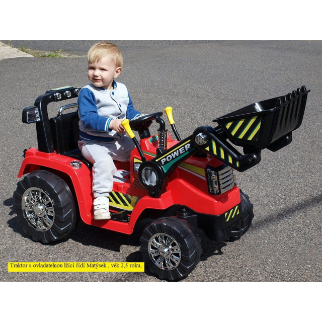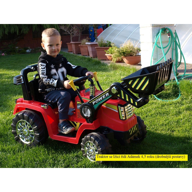 Elektrický 12V traktor s ovladatelnou lžící, masivní konstrukcí a mohutnými koly, zvukovými a světelnými efekty, 2 motory 45W / 12V s náhonem obou zadních kol, 4 možné rychlosti, s možností dokoupení vleku, vid. foto