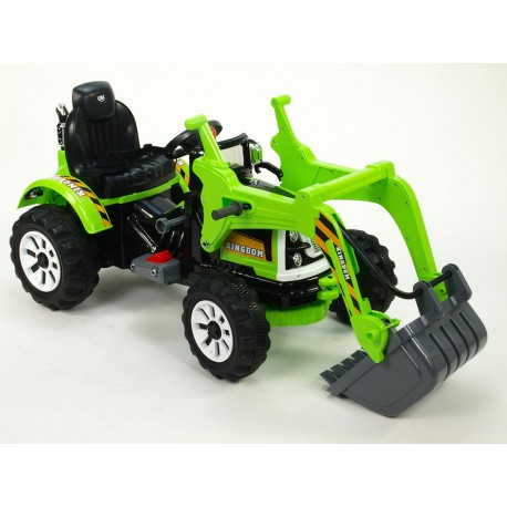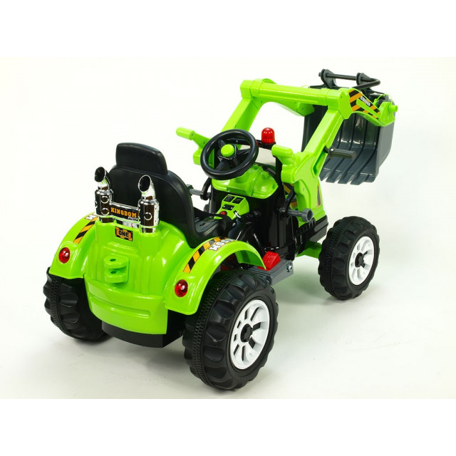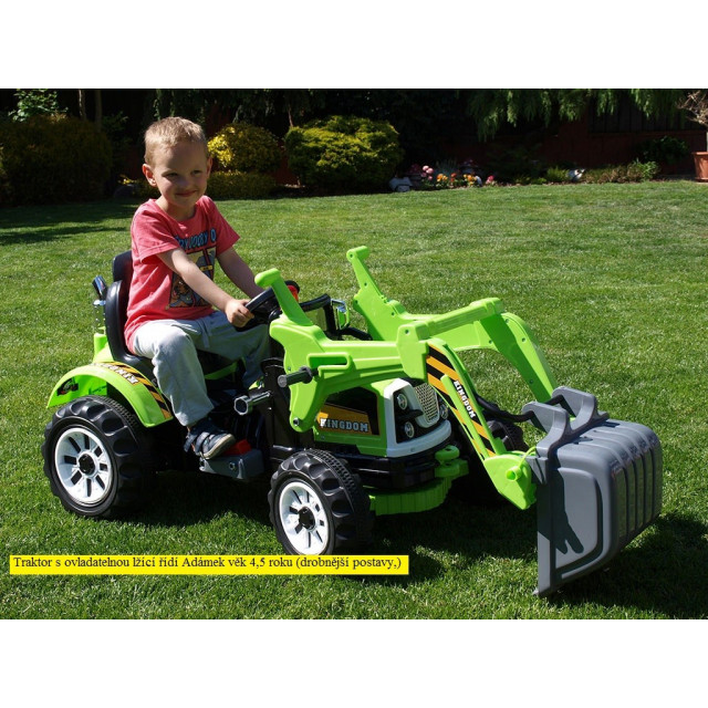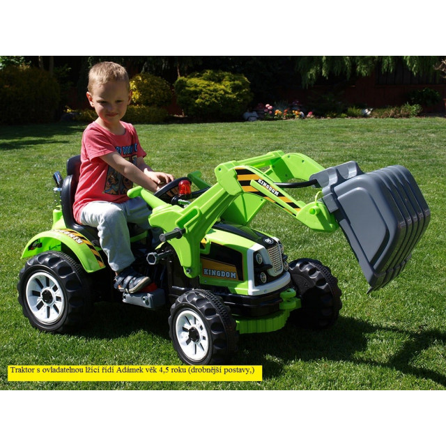 Elektrický 12V traktor Kingdom s ovládateľnou výkopovou lyžicou s masívnou konštrukciou a mohutnými kolesami, 2 motory 45W / 12V s náhonom oboch zadných kolies, 4 rýchlosti.