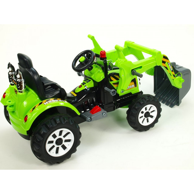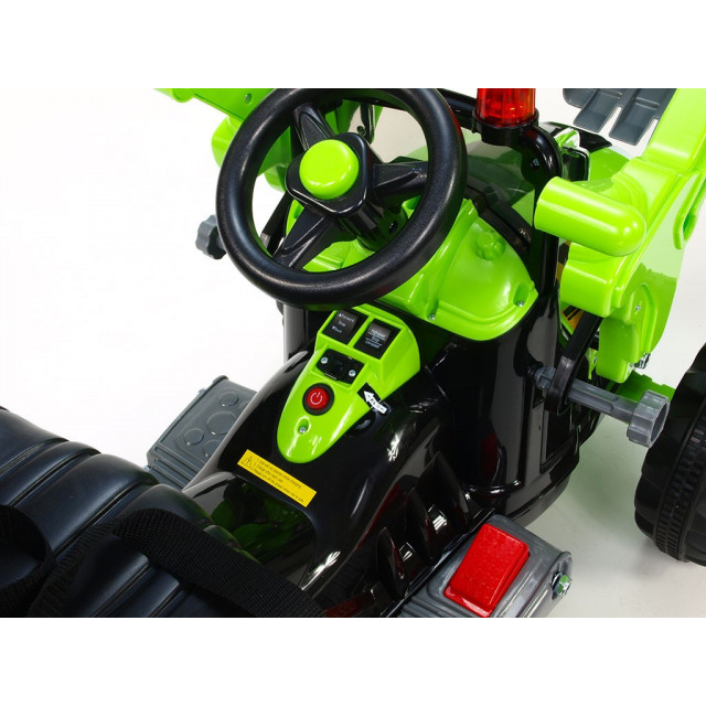 Popis: traktor má nádherný vzhled, kvalitní materiály a zpracování, ovladatelnou výkopovou lžící – sklopitelnou až na zem, po přepnutí vypínače a sešlápnutí pedálu jezdí vpřed a vzad, dalším přepínačem volíte pomalou nebo rychlou jízdu, na volantu tlakovou - vzduchovou houkačku, kola mají gumový pruh – toto zajišťuje tichou a příjemnou jízdu,
