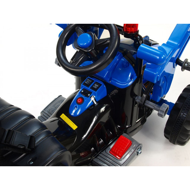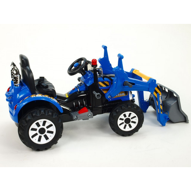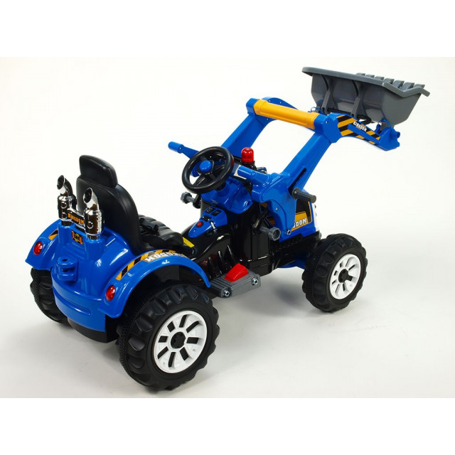 Popis: traktor má nádherný vzhled, kvalitní materiály a zpracování, ovladatelnou nakládací lžící – sklopitelnou až na zem, po přepnutí vypínače a sešlápnutí pedálu jezdí vpřed a vzad, dalším přepínačem volíte pomalou nebo rychlou jízdu, na volantu tlakovou - vzduchovou houkačku, kola mají gumový pruh – toto zajišťuje tichou a příjemnou jízdu,