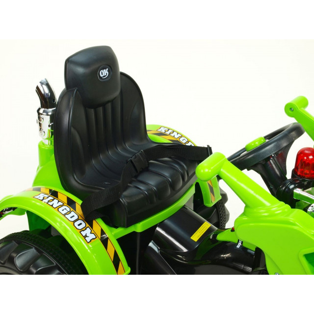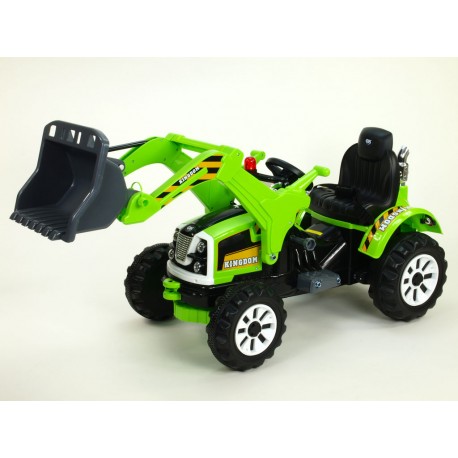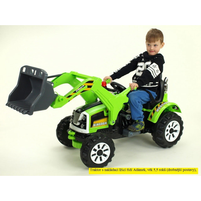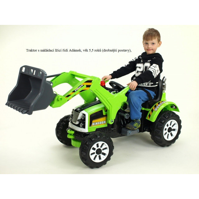 Elektrický 12V traktor Kingdom s ovládateľnou nakladacou lyžicou s masívnou konštrukciou a mohutnými kolesami, 2 motory 45W / 12V s náhonom oboch zadných kolies, 4 rýchlosti.
