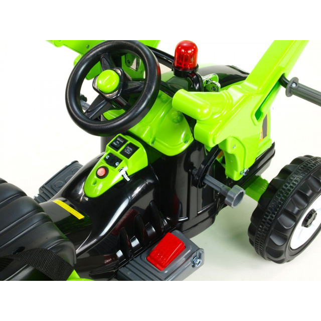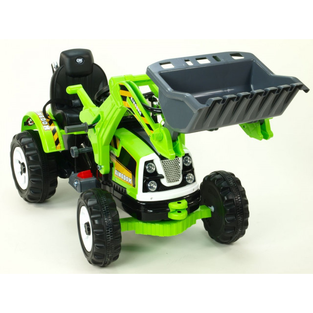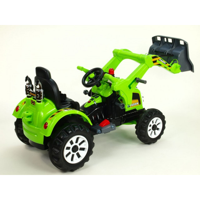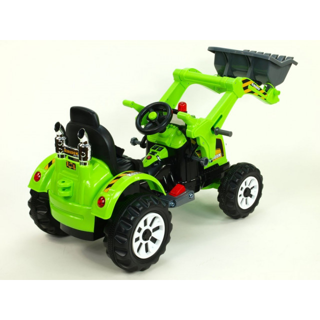 Popis: traktor má nádherný vzhled, kvalitní materiály a zpracování, ovladatelnou nakládací lžící – sklopitelnou až na zem, po přepnutí vypínače a sešlápnutí pedálu jezdí vpřed a vzad, dalším přepínačem volíte pomalou nebo rychlou jízdu, na volantu tlakovou - vzduchovou houkačku, kola mají gumový pruh – toto zajišťuje tichou a příjemnou jízdu,