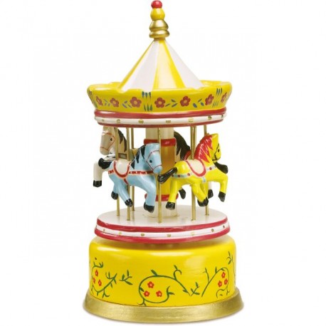 Krásna hracia skrinka v žltej farbe ako kolotoč, kde sa 4 kone otáča do melódie skladby "Talk To The Animals". Cítite tú vôňu pečených mandlí, cukrovej vaty a hudbu kolotočov?