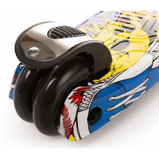 Trojkolesová konštrukcia (dve predné kolesá a jedno dvojité zadné koleso) robí kolobežku stabilnú a bezpečnú.