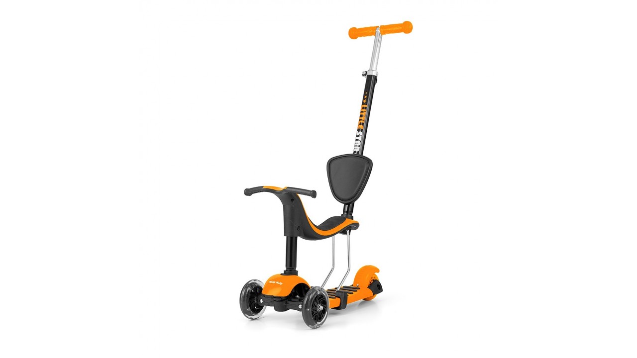 Super štýlová detská kolobežka Milly Mally Little Star. Nie je to len kolobežka, je to tiež odrážadlo pre deti od druhých narodenín, ktoré má sedadlo aj vodiacu tyč pre rodičov. Nosnosť do 20 kg. Sedadlo aj vodiacu tyč možno jednoducho zložiť a z odrážadlá sa razom stane kolobežka s nosnosťou do 50 kg.