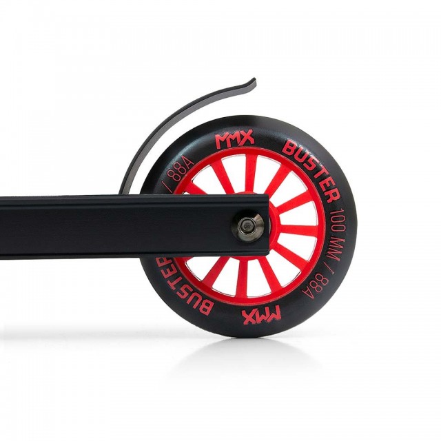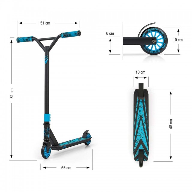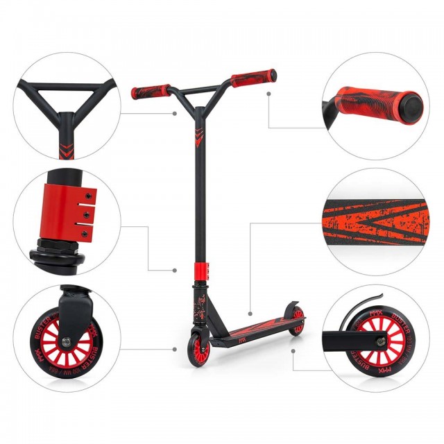 Freestyle kolobežky sú vyrobené z najkvalitnejších materiálov, aby bola zabezpečená najvyššia úroveň bezpečnosti počas freestylové jazdy. Konštrukcia kolobežky BUSTER je kombináciou hliníka a ocele, čo vedie k nízkej hmotnosti pri zachovaní dostatočnej tuhosti a najvyššej odolnosti. BUSTER je optimálnym vybavením pre začiatočníkov a stredne pokročilých používateľov. Široké riadidlá so zosilnenou konštrukciou a pogumované rukoväte z odolnej termoplastickej gumy TPR zaisťujú pevný úchop, ktorý je zárukou bezpečnosti pri vykonávaní kaskadérskych kúskov a trikov.