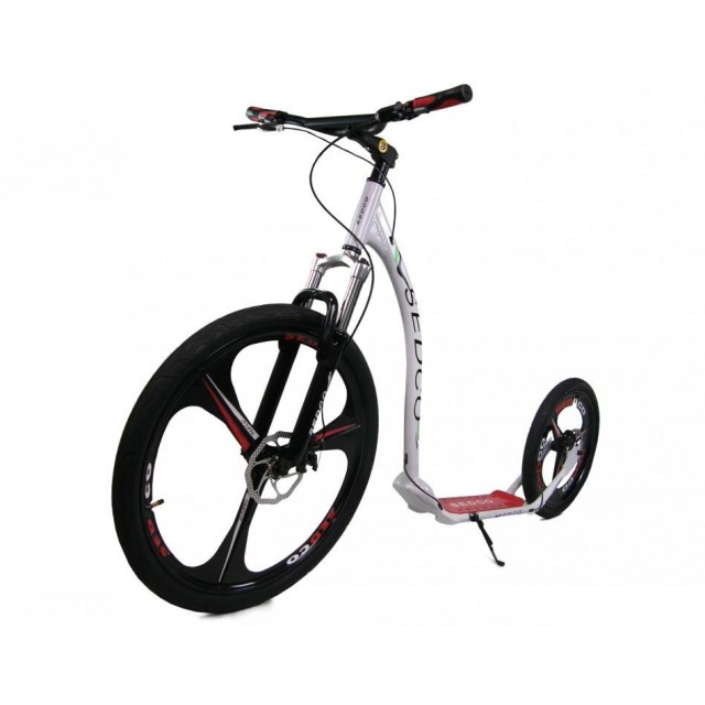 Atraktivní design a pevná konstrukce je základem pro tento model. Koloběžka je ideální zejména v městské a silniční dopravě. Díky 26-ti palcovému přednímu kolu zvládnete všechny nástrahy, ať už na silnici, v městech nebo na mírně nepříznivém povrchu.