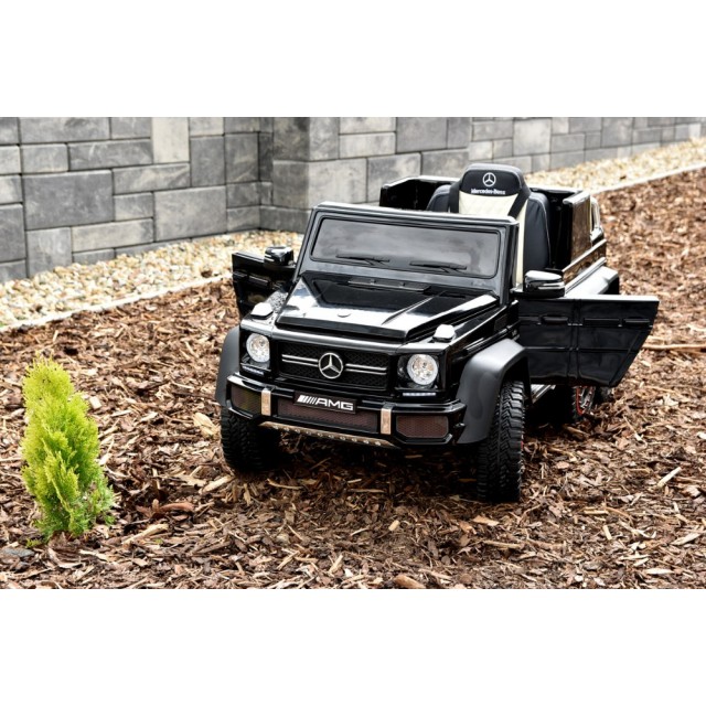 Elektrický jednomístný 6 kolový džíp Mercedes G63 AMG 24V, 2.4G bluetooth dálkové ovládání, USB, TF, voltmetr nabití baterie, LED osvětlení, otvírací dveře, náhon 2 zadních kol motory 2x 24V/200W, odpružení všech náprav, EVA kola, čalouněná sedačka s pásem, zadní úložný prostor, kvalitní materiály a zpracování, lakovaný metalízou.