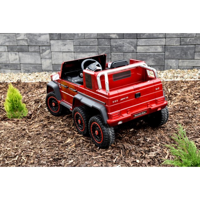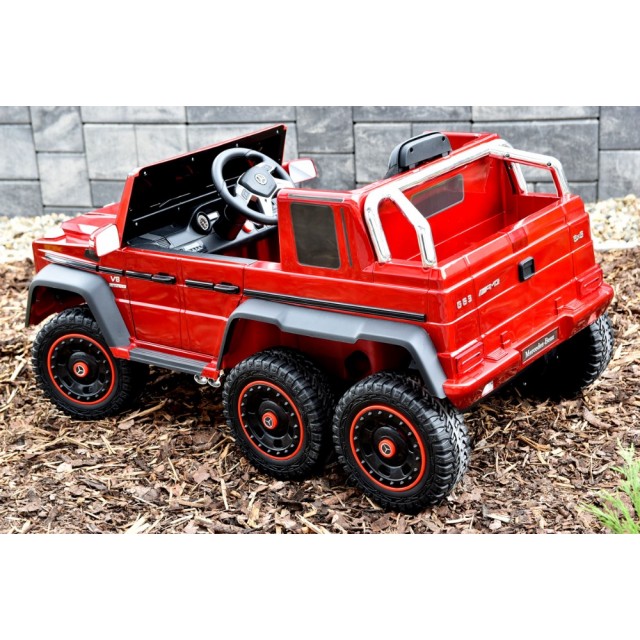 Elektrický jednomístný 6 kolový džíp Mercedes G63 AMG 24V, 2.4G bluetooth dálkové ovládání, USB, TF, voltmetr nabití baterie, LED osvětlení, otvírací dveře, náhon 2 zadních kol motory 2x 24V/200W, odpružení všech náprav, EVA kola, čalouněná sedačka s pásem, zadní úložný prostor, kvalitní materiály a zpracování, lakovaný metalízou.