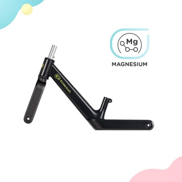 - Vďaka zliatine horčíka je bicykel super ľahký: špecifická hmotnosť zliatiny horčíka je o 1/3 menšia ako u hliníka a o 3/4 menšia ako u ocele. Rám dokonale tlmí vibrácie a je tiež 100% recyklovateľný a opakovane použiteľný. Horčík použitý na rám je zároveň odolný voči poškodeniu a korózii. Bicykel bude slúžiť Vášmu dieťaťu roky.