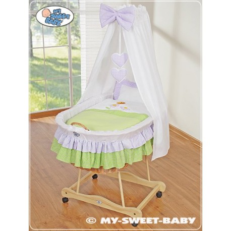 9) dřevěný podvozek je stabilní, pevný a dole má 4 kolečka, zajišťující snadný pohyb koše z pokoje do pokoje. Dva přední kolečka jsou s brzdou, zajišťují větší bezpečnost dítěte. Podvozek je v barvě bílé !