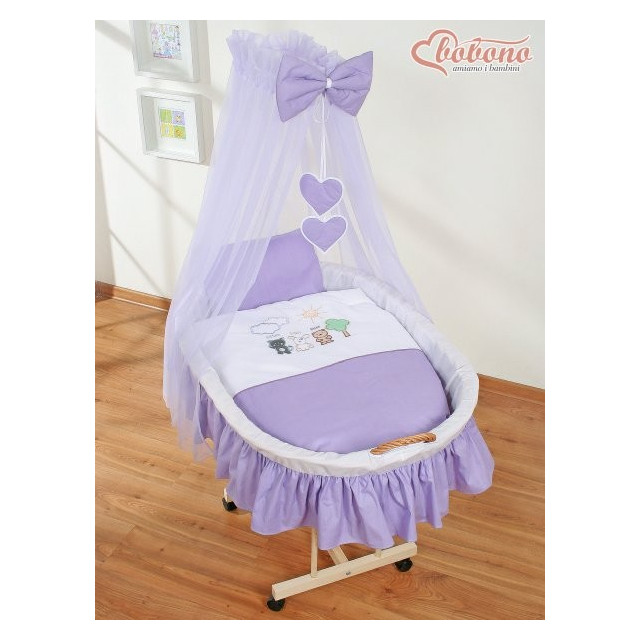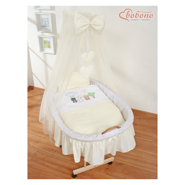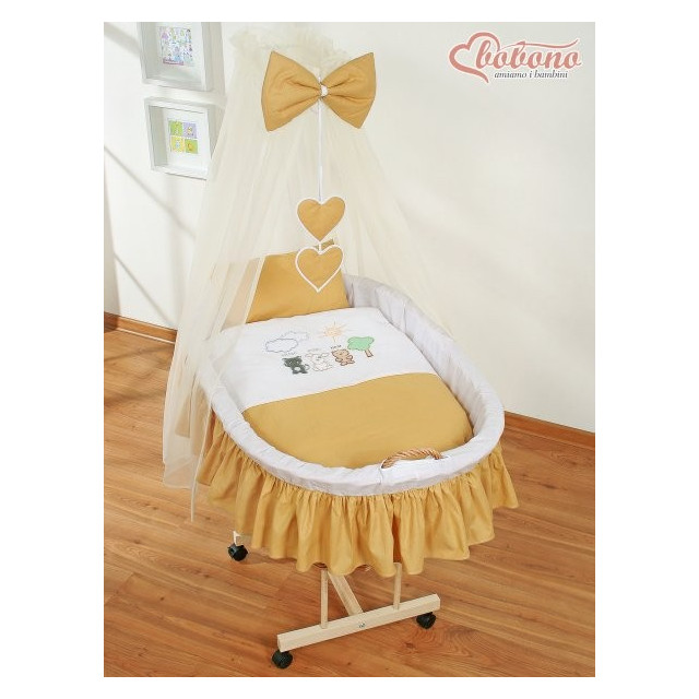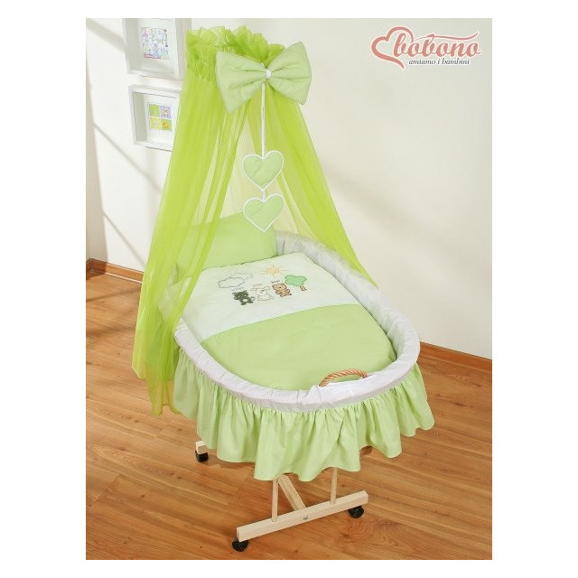 7) dřevěný podvozek je stabilní, pevný a dole má 4 kolečka, zajišťující snadný pohyb koše z pokoje do pokoje. Dva přední kolečka jsou s brzdou, zajišťují větší bezpečnost dítěte.