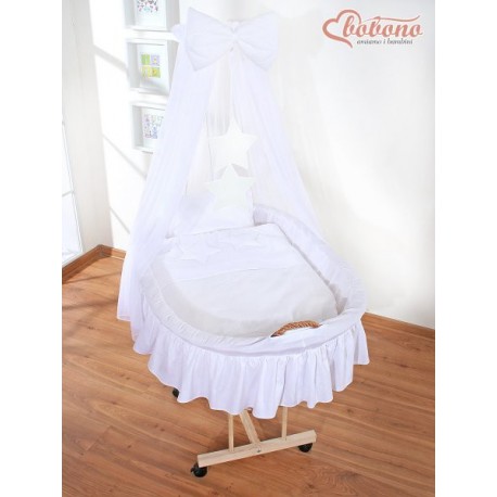 1) proutěný koš ručně vyplétaný ze zdravotně ekologického proutí. Dno koše má rozměr 80 x 45 cm a proto je ho možno užívat až do cca 6 měsíců věku dítěte. Přední úchyt zajišťuje lepší manipulaci s košem a usnadňuje uspávání miminka.