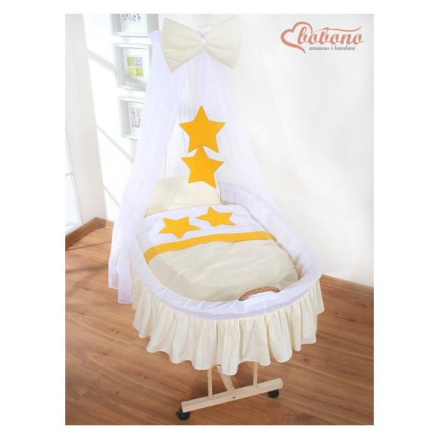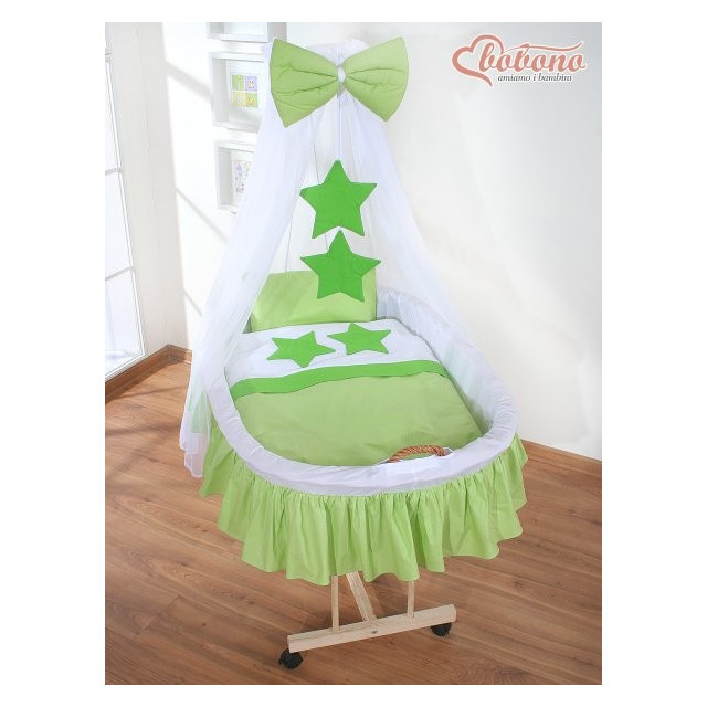 9) dřevěný podvozek je stabilní, pevný a dole má 4 kolečka, zajišťující snadný pohyb koše z pokoje do pokoje. Dva přední kolečka jsou s brzdou, zajišťují větší bezpečnost dítěte.
