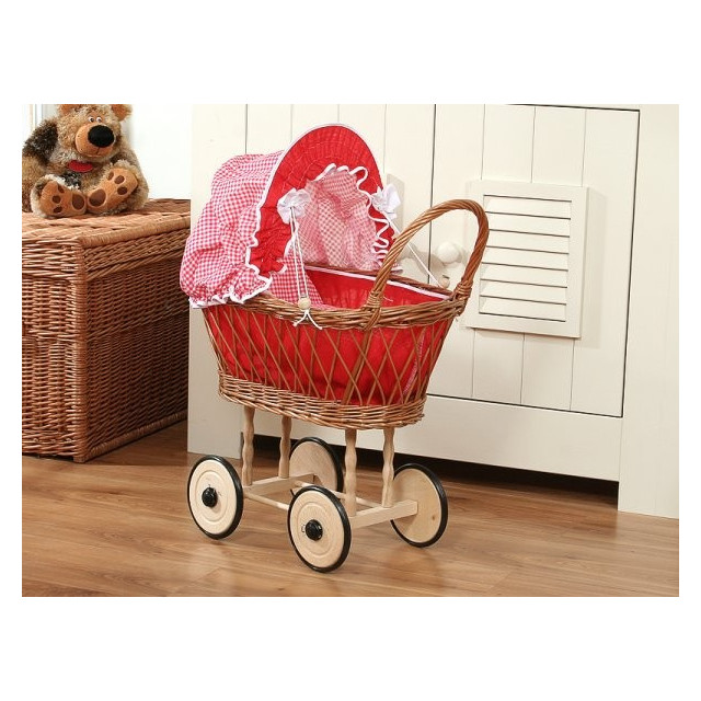 Koš je vyplétán ručně z proutí, stabilní dřevěný podvozek, kolečka jsou nasazené na kovové osy se zabezpečením "click-clack", aby kolečka nevypadávala. Dřevěné kolečka mají po obvodu nasazené gumové profily. Součásti kočárku je polštářek, přikrývka a obšití košíku a sklápěcí bouda.