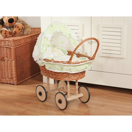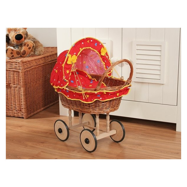 Koš je vyplétán ručně z proutí, stabilní dřevěný podvozek, kolečka jsou nasazené na kovové osy se zabezpečením "click-clack", aby kolečka nevypadávala. Dřevěné kolečka mají po obvodu nasazené gumové profily. Součásti kočárku je polštářek, přikrývka a obšití košíku a sklápěcí bouda.