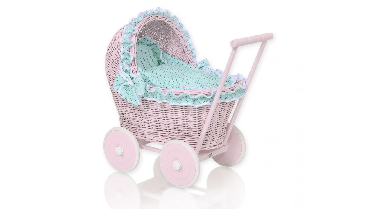 Krásný proutěný kočárek pro panenku značky MY SWEET BABY je nejvyšší jakostní výrobek pro děti. Přírodní proutí a dřevo v barvě růžové tvoří spolu s barvami materiálu jedinečný celek. Materiál obšití koše a boudičky, polštářek a přikrývka je bílá krajka.