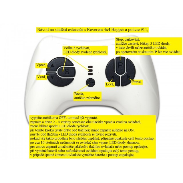 3 rychlosti jízdy na DO + zatáčení, s přednostní jízdou na DO před pedálem, tzn. můžete dítě ovladačem zastavit,