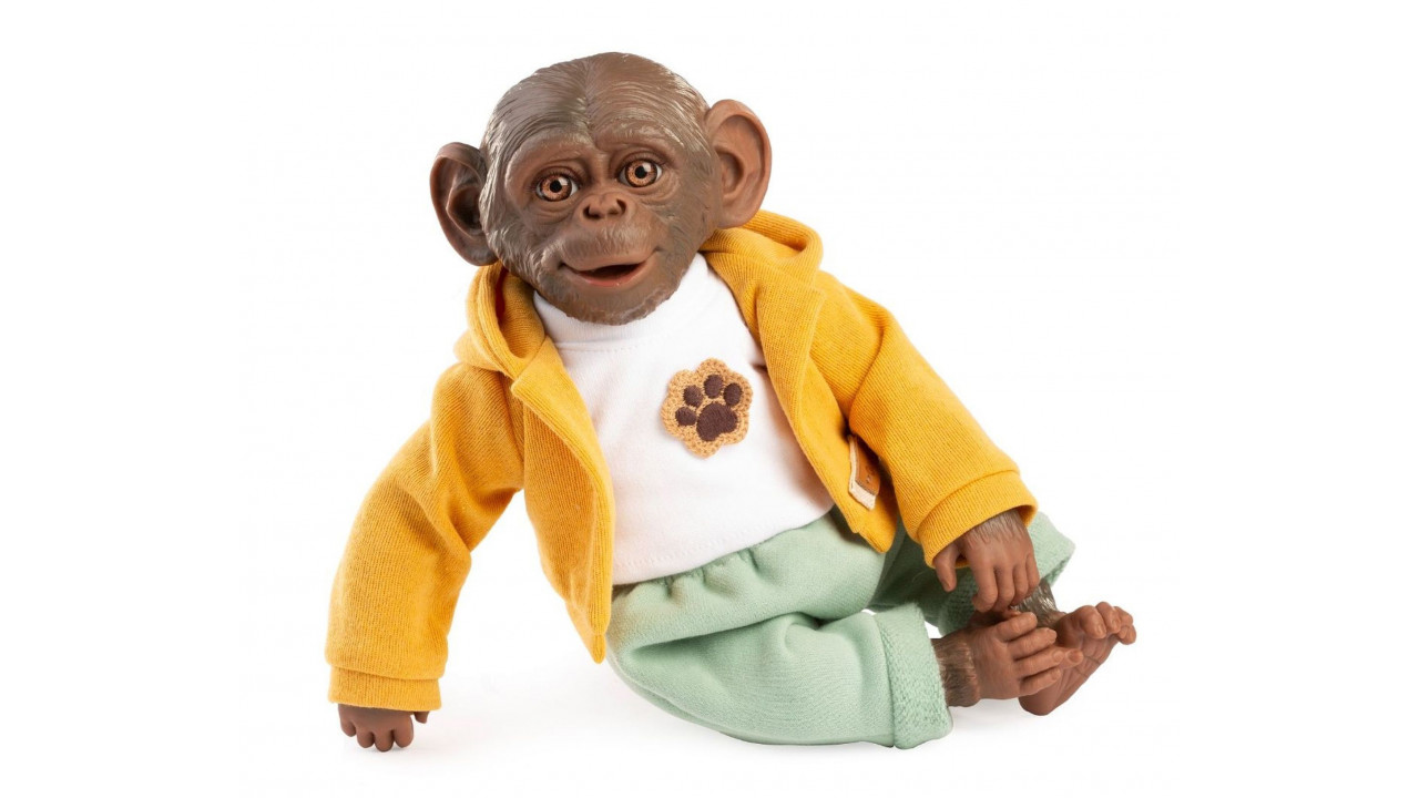 Veselé a roztomilé opičie bábätko bez zvuku s mäkkým látkovým telom. Hlava a končatiny sú vyrobené z kvalitného vinylu. Ruky a nohy sú k telu prichytené kĺbom. Opičie bábätko je polohovacie a môže aj sedieť alebo sa dá zavesiť za ruky alebo nohy. Veľkosť 32 cm. Ručne vyrobené v Španielsku, balené v darčekovej krabici. Odporúčaný vek od 3 rokov.