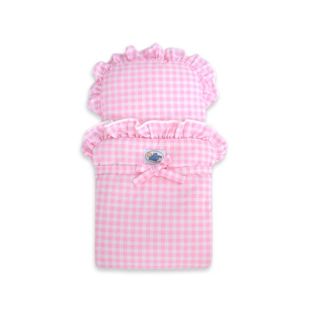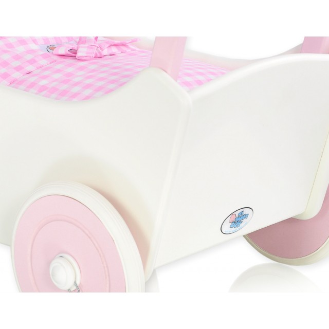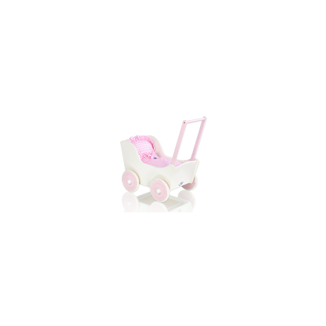 Dřevěné kolečka mají po obvodu nasazené gumové protiskluzové profily, které nezanechávají čmouhy na podlaze. Součásti kočárku je polštářek a přikrývka.