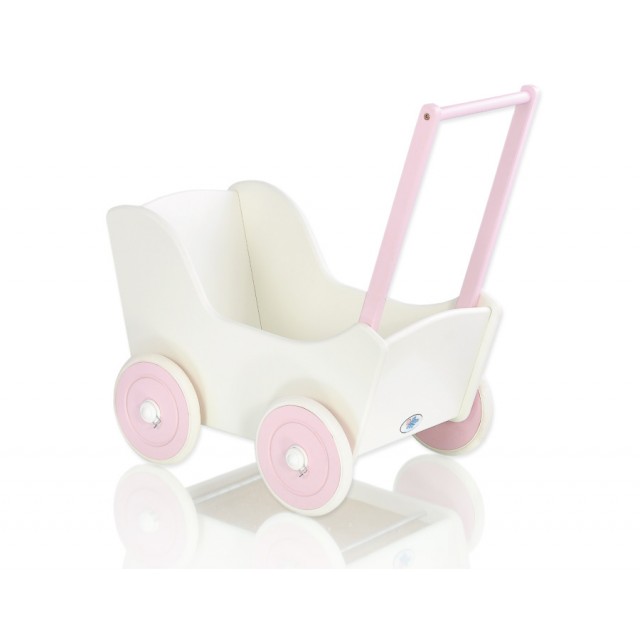 Skvelý darček pre malé dievčatko. Kočík pre bábikyje top produkt pre deti. Vyrobené z bezpečných materiálov. Maľované ekologickými farbami. Kolesá sú osadené na kovových osiach, s mechanizmom click-clack, vďaka čomu sa ľahšie otáčajú a nepadajú.
