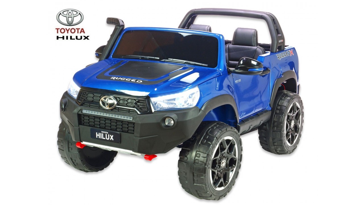 Elektrický pickup Toyota Hilux Rugged 4x4 s 2,4G bluetooth dálkovým ovládáním, náhon všech EVA kol 4x4, start klíčem, USB, bluetooth, voltmetr, LED osvětlení, otvírací dveře, kapota a zadní čelo, madlo pro tažení, čalouněná dvousedačka s pásy, kvalitní materiály a zpracování, originální vzhled, lakovaná barva.