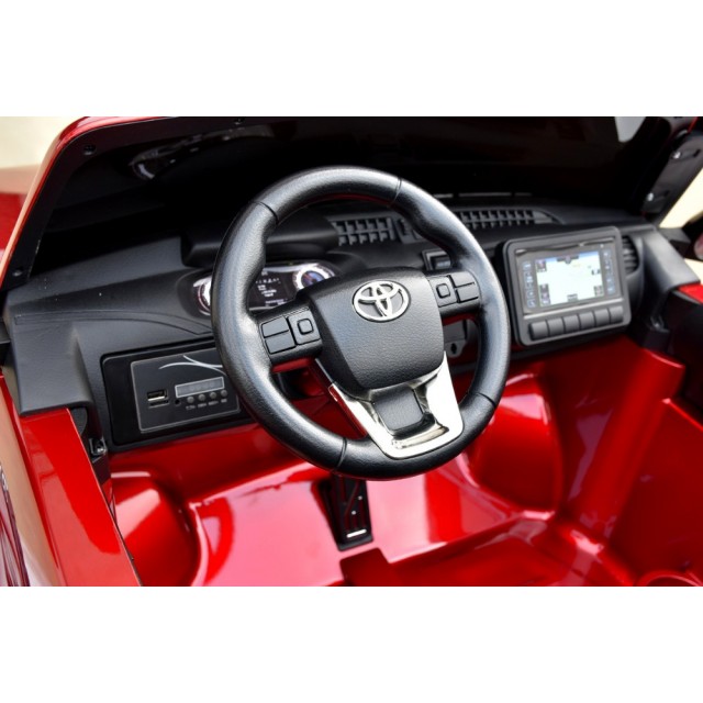 Elektrický pickup Toyota Hilux Rugged 4x4 s 2,4G bluetooth dálkovým ovládáním, náhon všech EVA kol 4x4, start klíčem, USB, bluetooth, voltmetr, LED osvětlení, otvírací dveře, kapota a zadní čelo, madlo pro tažení, čalouněná dvousedačka s pásy, kvalitní materiály a zpracování, originální vzhled, lakovaná barva.