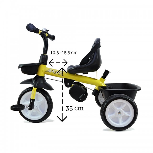 Detská šliapacia trojkolka s rukoväťou Axel je určená pre deti vo veku od 1 do 3 rokov. Je vyrobená z kvalitných a odolných materiálov. Má pohodlné a ergonomicky tvarované sedadlo, kde vzdialenosť k riadidlám možno ľahko nastaviť a tým prispôsobiť trojkolku veku a výške dieťaťa.