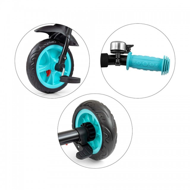Bicykel je vybavený zábranou chrániacou dieťa pred vypadnutím, päťbodové bezpečnostné pásy a stúpačky a penové kolesá umožňujú tichú a pohodlnú...